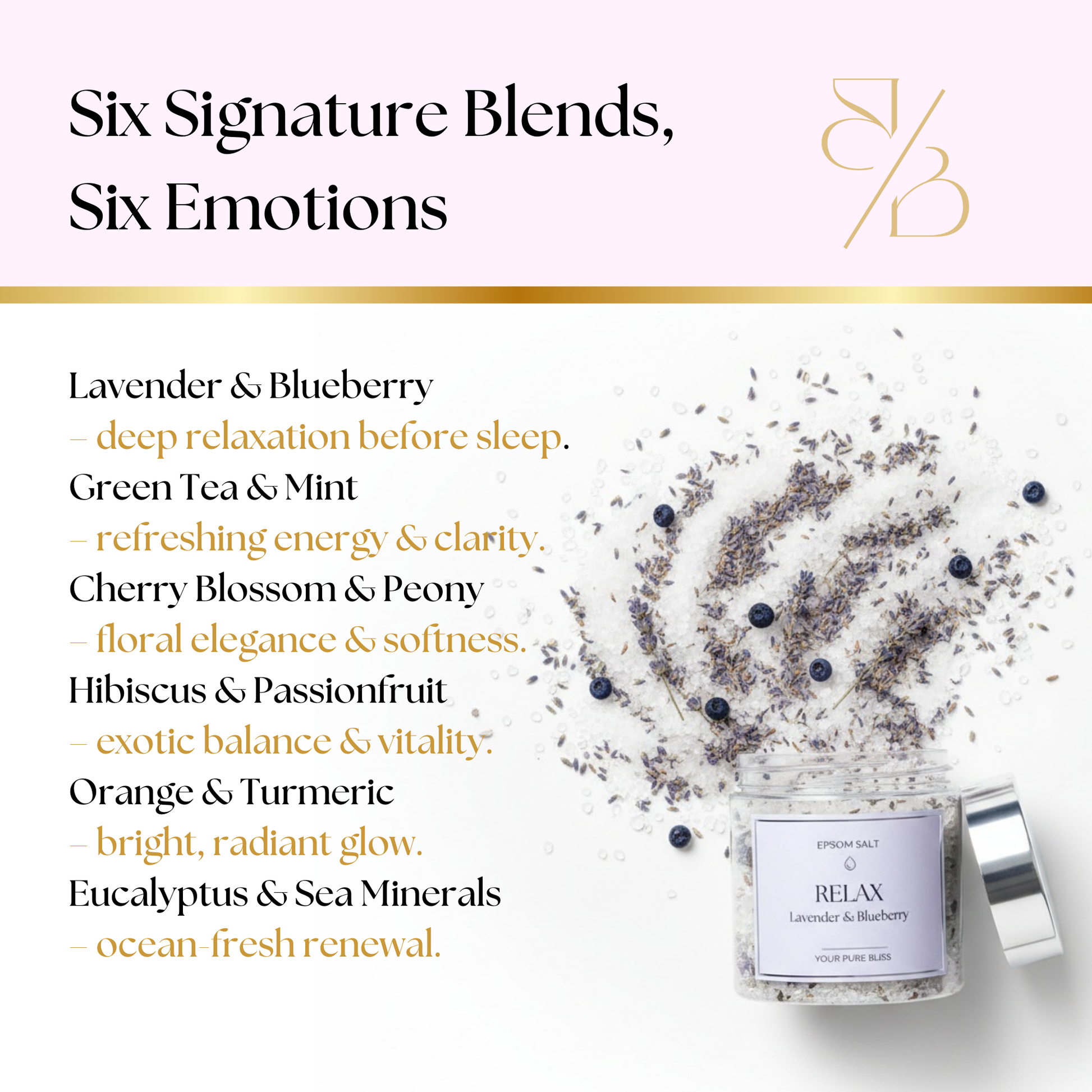 - Relax – Lavender & Blueberry: for deep rest and release